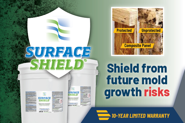 Economical SurfaceShield is a ready-to-use water-based product and is available in economical 5 gallon pails. Applied with an airless sprayer, one gallon can protect up to 1,000 square feet (93 square meters). Applying SurfaceShield adds significant value to any construction or water damage remediation project.
